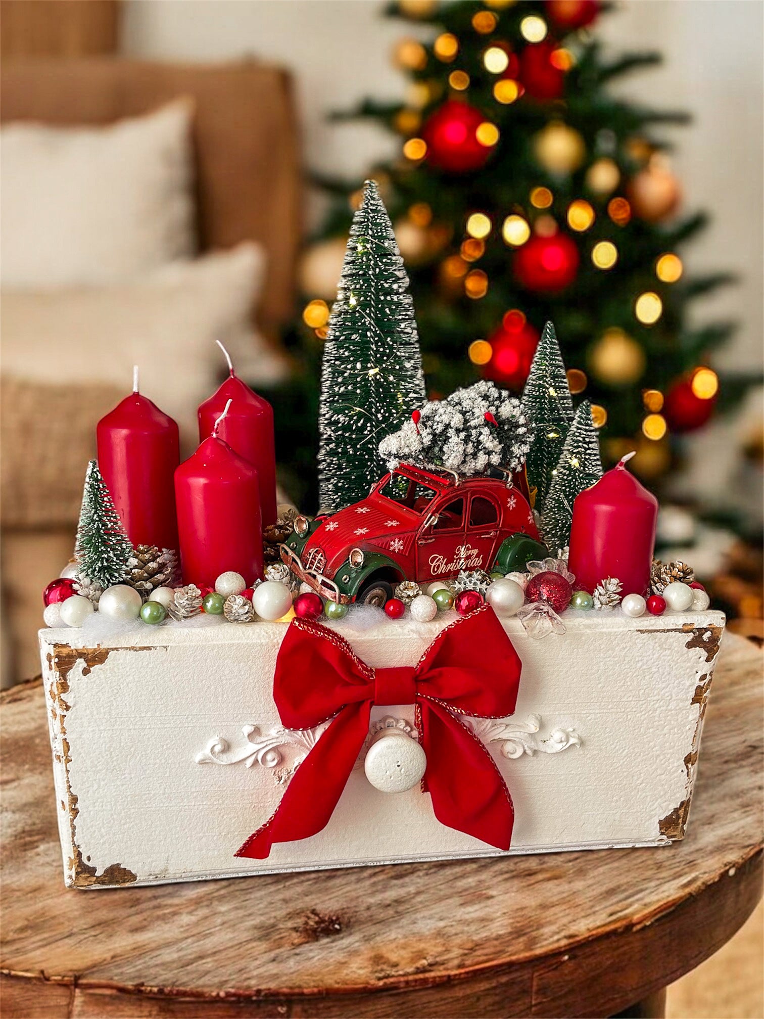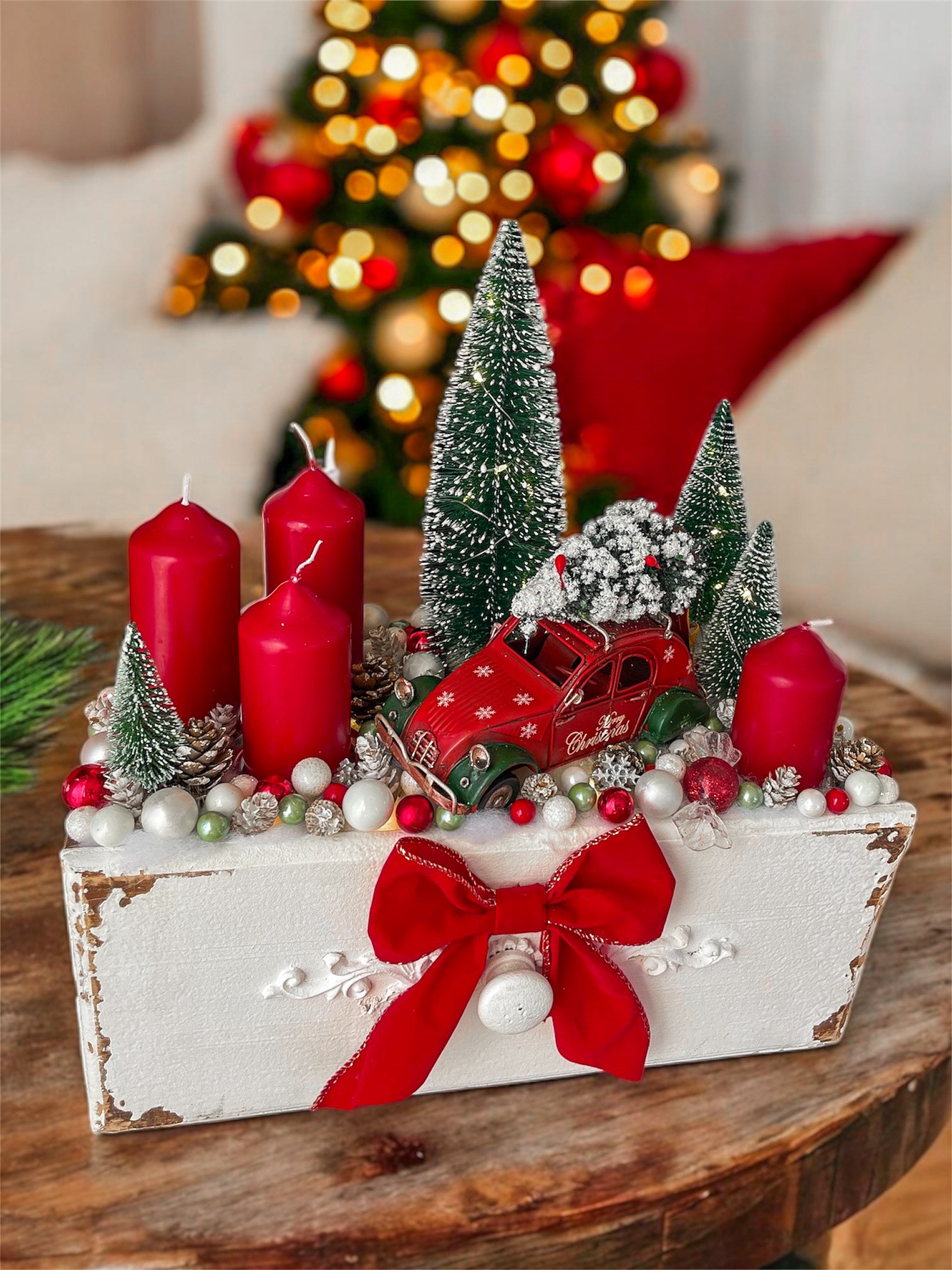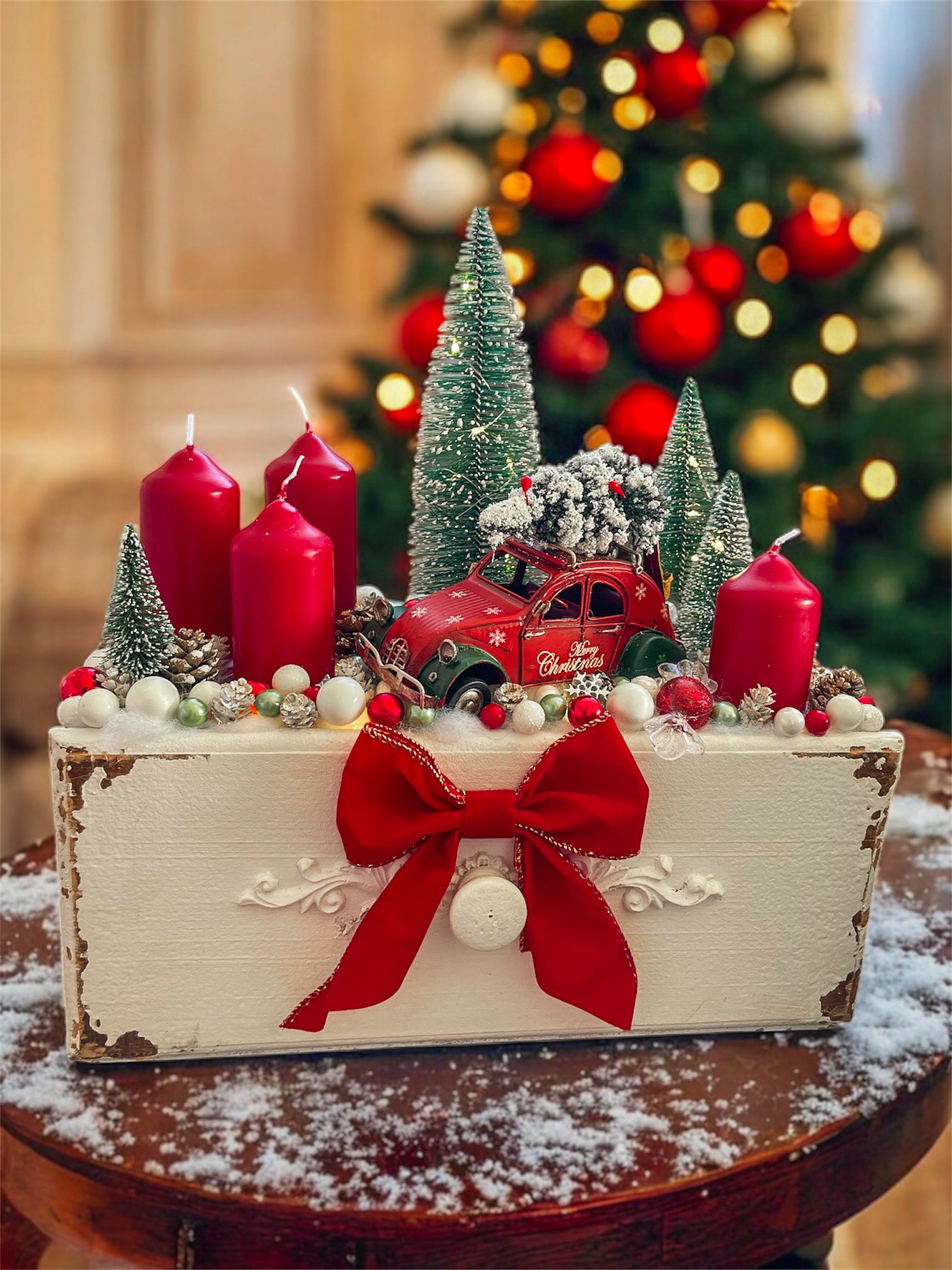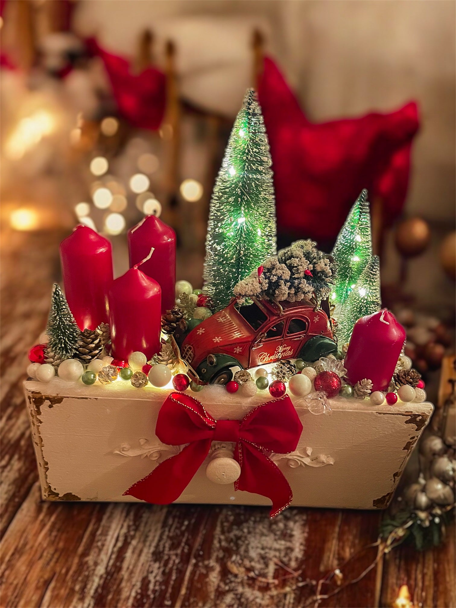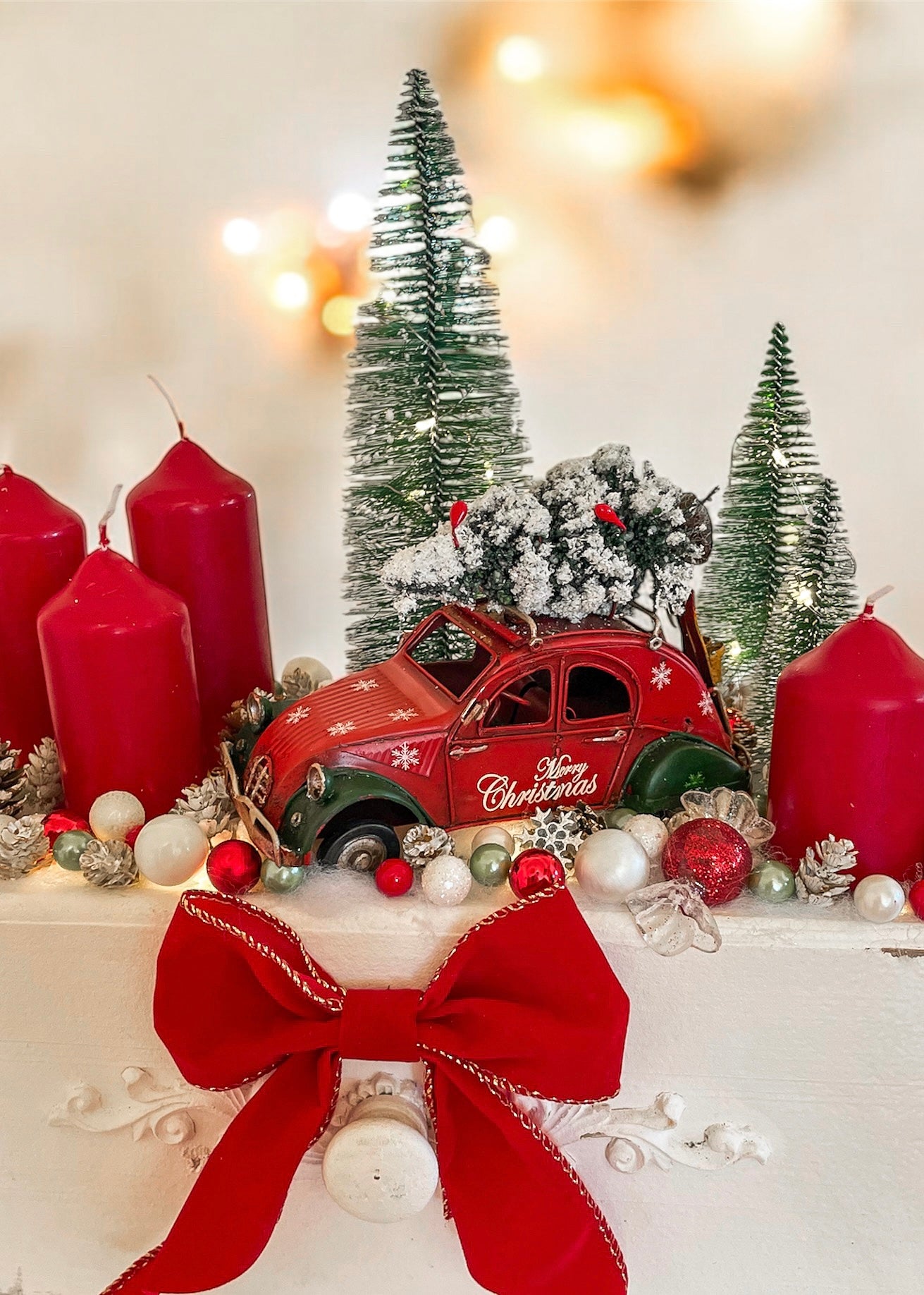 Klassische rote Kerzen, schneebedeckte Tannenbäumchen und ein kleines Vintage-Auto errinern an die Magie vergangener Weihnachten.